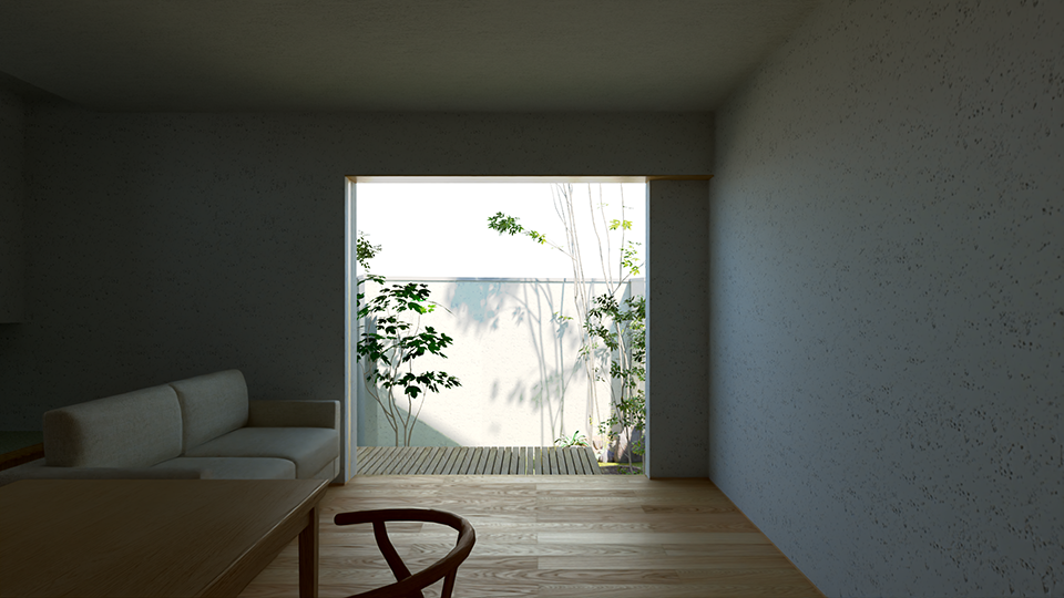リビングから眺められる庭は、苔や草木の香りを漂わせ、雨の日には鎖樋に落ちる雨音が心にやすらぎを与えます。ご夫婦が望まれたのは街中にある静けさでした。外とのつながりから四季を眺め、障子越しの陰影を愉しむ。映し出される庭木の陰影が時間の経過をそっと知らせます。光・影・風・音が住まう人に静謐さを感じさせます。