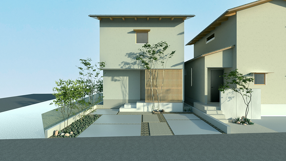 外観には縦格子をあしらい、視線を程よく遮りながら和の趣を漂わせます。植栽を愛でる時間を楽しみたいというオーナーさまの想いを込めたアプローチは、毎日の行き帰りに四季の移ろいを感じられます。街並みに自然と溶け込みながらも、確かな個性を放つ住まいをデザインしました。