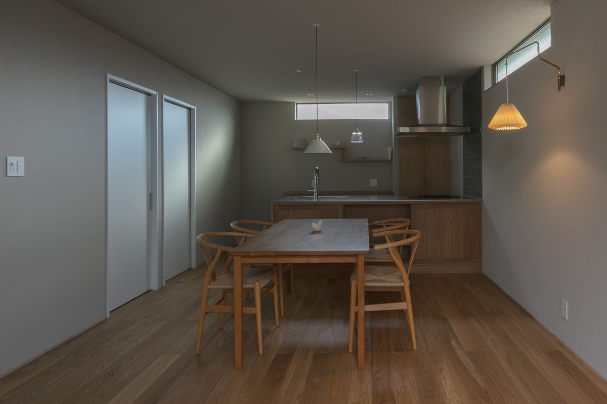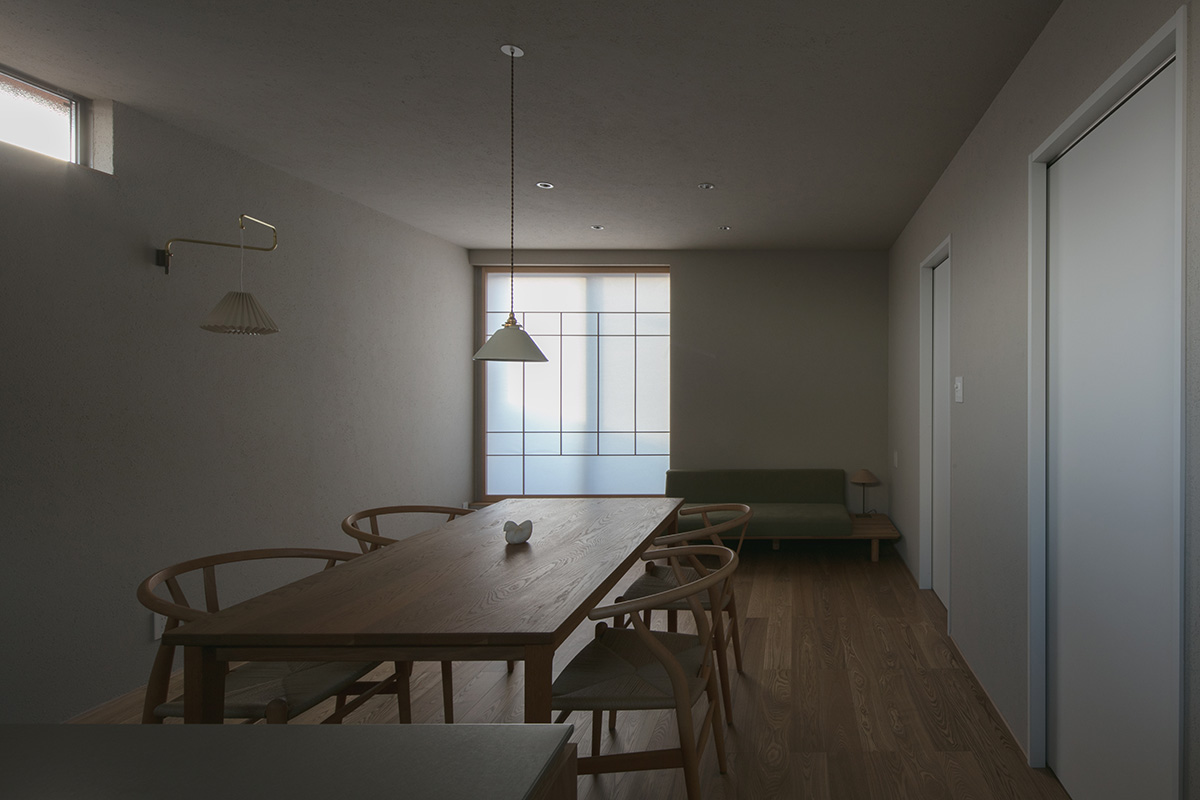 2階のリビングは、バルコニーにつながる窓から山々の景色を取り込み、心地よい開放感に包まれます。障子を通して差し込む柔らかな光が陰影を生み、落ち着いた雰囲気を演出します。朝の光に照らされるキッチンや夕暮れに染まる景色は、1日の時間の経過を感じさせ、日々の暮らしに彩りを添えます。