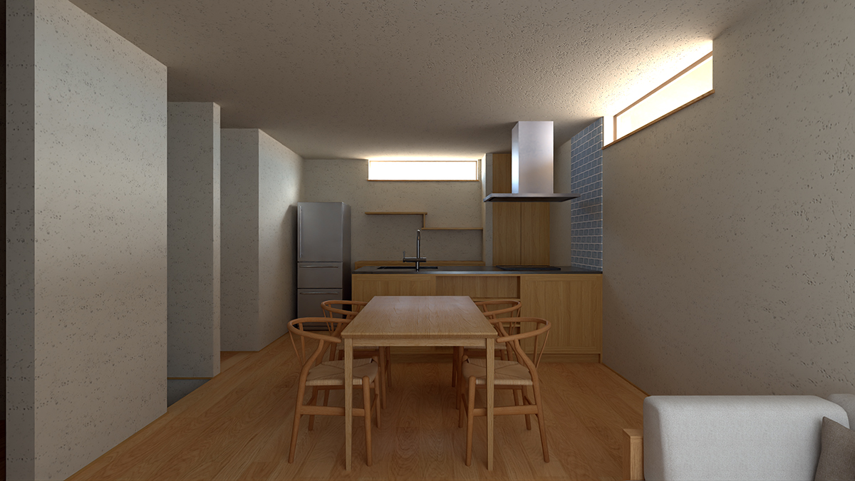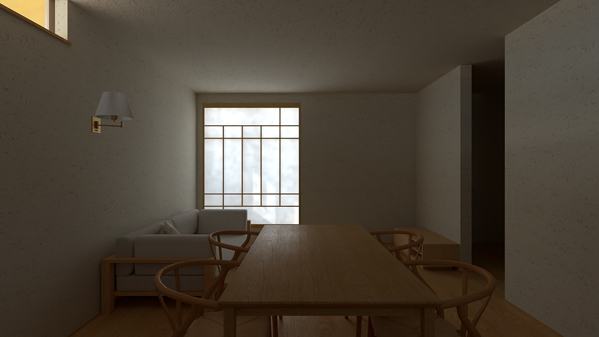 2階のリビングは、バルコニーにつながる窓から山々の景色を取り込み、心地よい開放感に包まれます。障子を通して差し込む柔らかな光が陰影を生み、落ち着いた雰囲気を演出します。朝の光に照らされるキッチンや夕暮れに染まる景色は、1日の時間の経過を感じさせ、日々の暮らしに彩りを添えます。