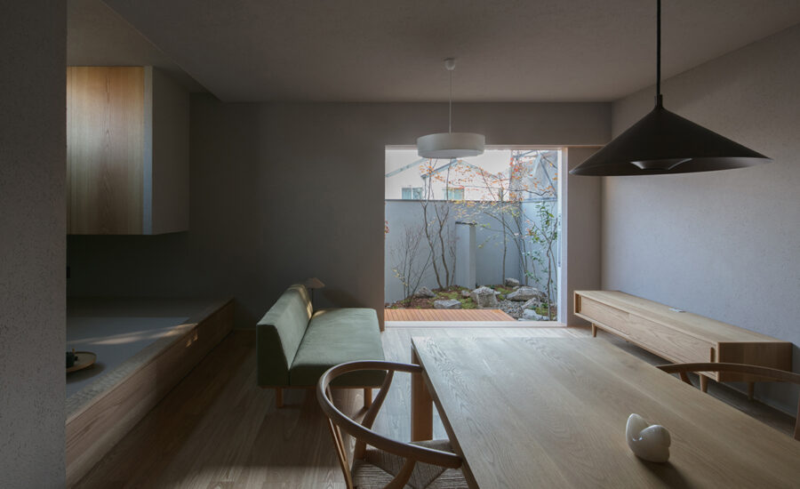 山々に囲まれた歴史ある土地に構えられた住宅。リビングと繋がる半外空間の内庭は、優しい光を取り込みながら、外からの視線を切り一家団欒のひとときを楽しむことができます。製作キッチンや家具・照明などご夫婦のミニマルを適所に散りばめ、暮らしに彩りを添えました。