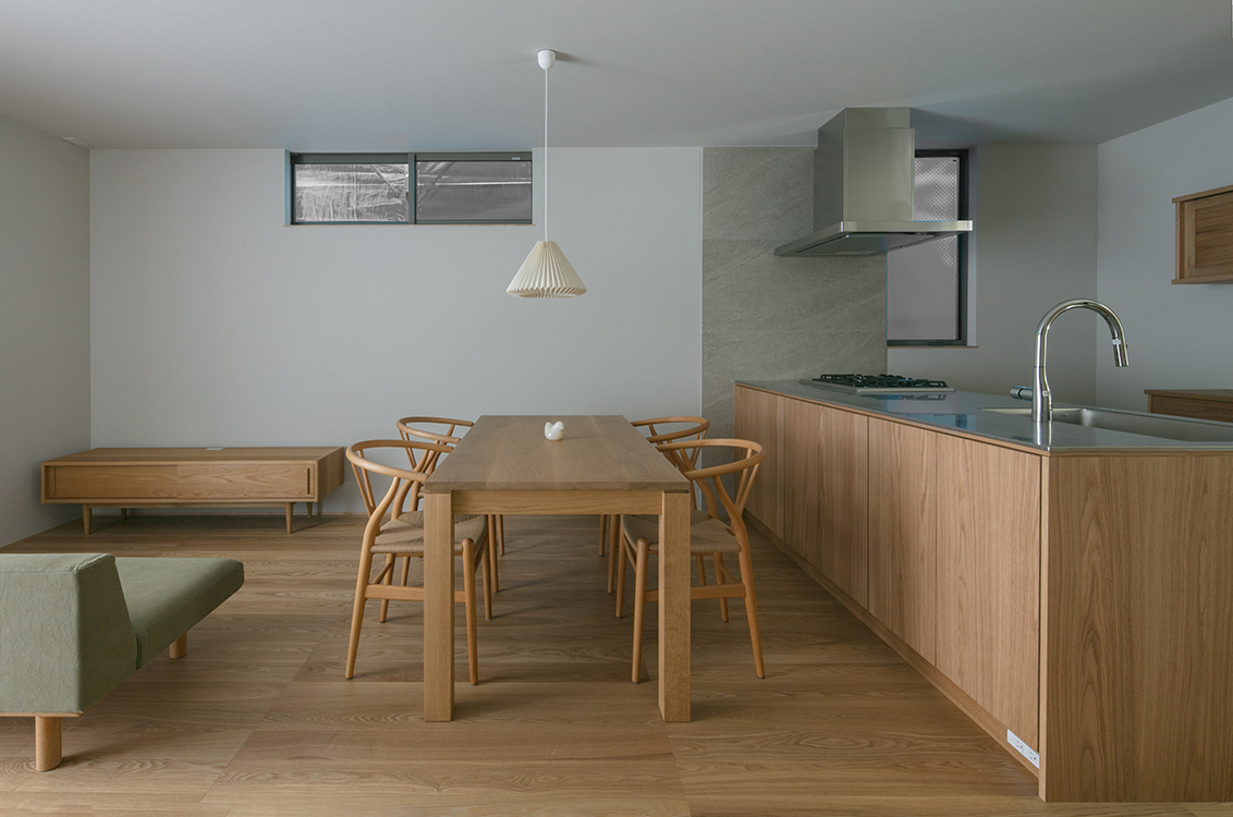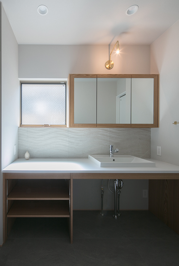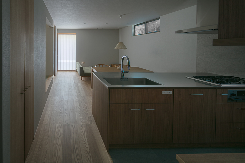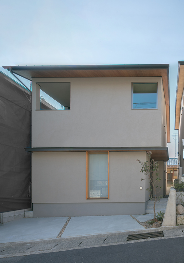 水平ラインを意識した、シンプルな美しさ。外壁にはジョリパットの割肌仕上げを施し、光の移ろいによって豊かな表情を描き出します。街に溶け込みながらも、奥行きを感じさせる佇まい。植栽を眺めながらアプローチを進むことで、日々の喧騒から気持ちを切り替え、一日の疲れを静かにほどく。そんな安らぎへと誘う導入空間を設計しました。