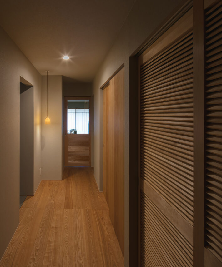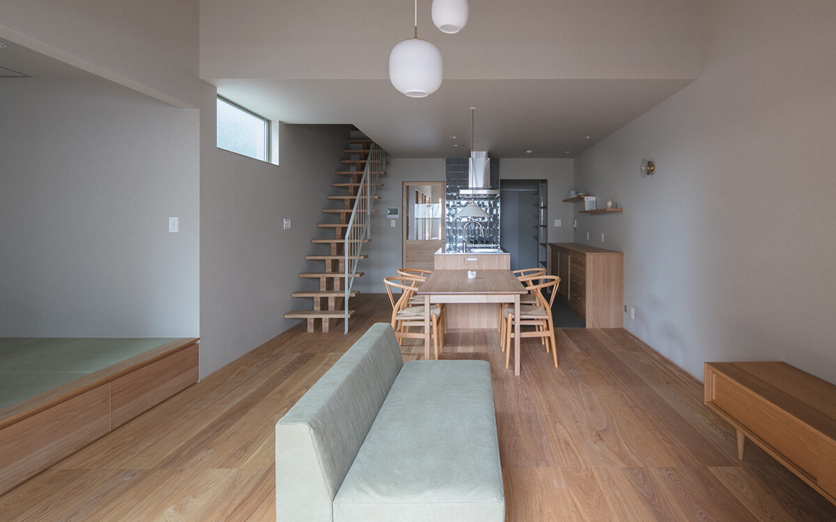 「人が自然と集い、ゆったり過ごせる場」。それが家づくりのテーマでした。限られた土地条件の中で、駐車・駐輪スペースを確保しつつ、住む人に憩いをもたらすウッドテラスを設けました。そして何よりも大切にしたのは「開放感」。奥へ進むほどに広がる空間設計の醍醐味をぜひご体感ください。